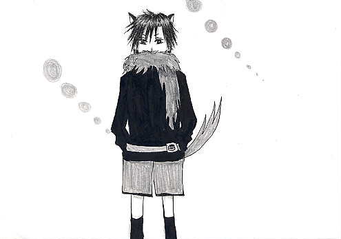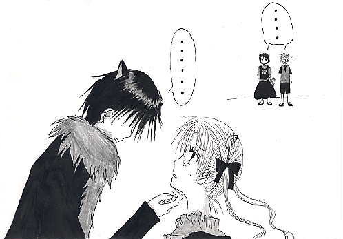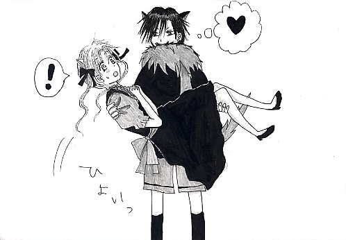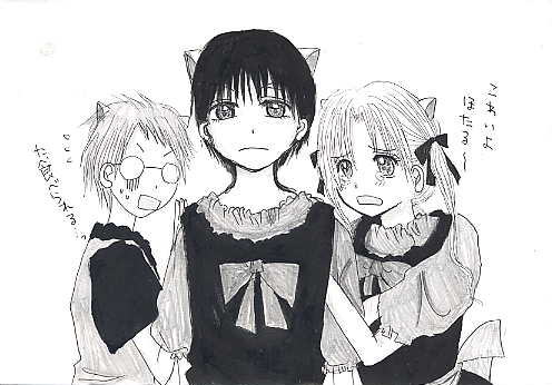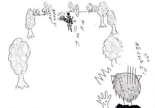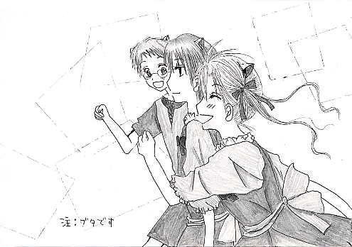 ブ タ は 密 か に 笑 う あるところに、村でも仲良しと有名な三匹の子豚がおりました。 ![]() 眼鏡をかけたオスブタの名は『裕』、クールなショートカットのメスブタは『蛍』、 ツインテールの元気なメスブタは『蜜柑』といいました。 今日も三匹は仲良く走り回っていました。 しかし、そんなところに。 ![]() 一匹の恐そうなオスの狼が三匹の前に現れました。 狼は、お腹がぺこぺこです。 ![]() 三匹のうち二匹は恐くて恐くて蛍にしがみ付いていました。 一方、蛍は恐がることもなく、じーっと見詰め返して反抗します。 そんな蛍に少し困りましたが、狼は気を取り直し、 どの子豚を食べようか、じーっと二匹を見詰めました(蛍は遠慮しときました) ![]() 狼は暫く見詰めてから、一匹の子豚、蜜柑の目の前にやってきました。 そして、泣きそうな蜜柑の顔をくいっと持ち上げると、じーっと見詰めます。 蜜柑に決めたのでしょうか。 ![]() すると狼は、ひょいっと蜜柑をお姫様抱っこで抱き上げました。 蜜柑を食べる気です。 食べるのは勿論ですが、それだけではありません。 狼は、蜜柑をお嫁さんにするつもりです。 狼は、一瞬蜜柑を目にした途端、一目惚れしてしまったのです。 ![]() 狼は蜜柑を抱き上げたまま、森の奥へ歩いていってしまいました。 裕は必死に二匹に向かって叫びましたがそれは無意味でした。 とうとう二匹は消えていってしまいました。 裕は泣きました。 しかし。 ![]() 蛍は、笑っていました。 END ------------------------------------------------- すいません、元の話とか全然無視してます…(汗 それに最後まで何が言いたいのかさっぱり訳がわかりません。 すいません; 棗が蜜柑を連れ去って、蛍が面白そうにしてるとこを書きたかっただけです…; 何だかスキャナで取り込んだら画像が汚くなってしまいました。 |